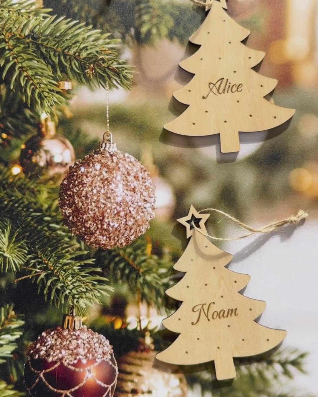Finement découpé et gravé, il apporte un charme naturel et authentique à votre sapin, tout en offrant la possibilité d’y ajouter le prénom de votre choix.